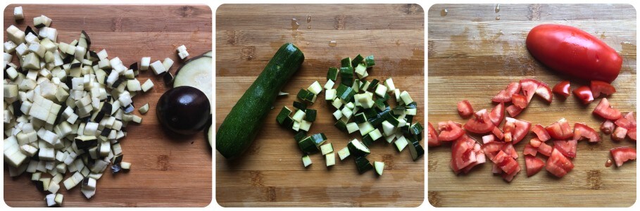 • Die Aubergine und die Zucchini putzen, waschen und in Würfel schneiden.