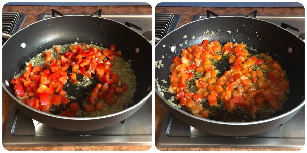 • Für ein paar Minuten brutzeln lassen, dann die Paprika hinzufügen und fünf Minuten anbraten, dabei gelegentlich umrühren.