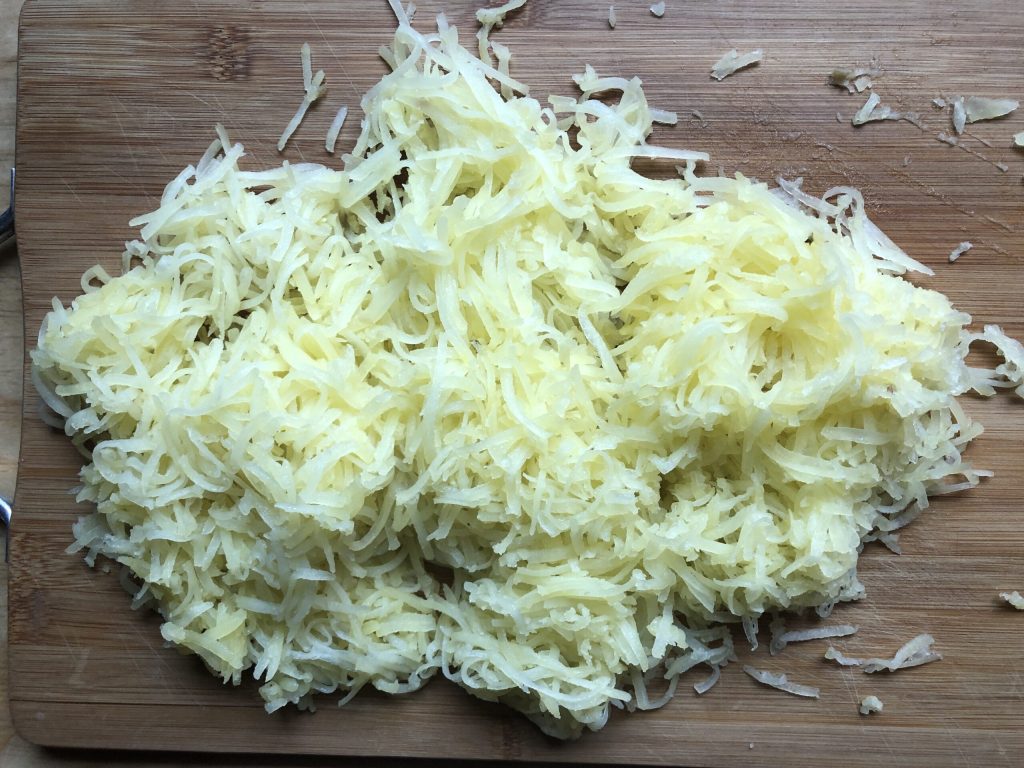 Dann abtropfen lassen, leicht abkühlen lassen, schälen und mit einer Reibe mit groben Löchern reiben.