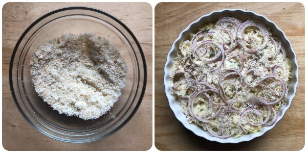 In einer kleinen Schüssel das Paniermehl mit dem geriebenen Käse mischen und diese Mischung über die Oberfläche der Auflaufform streuen.