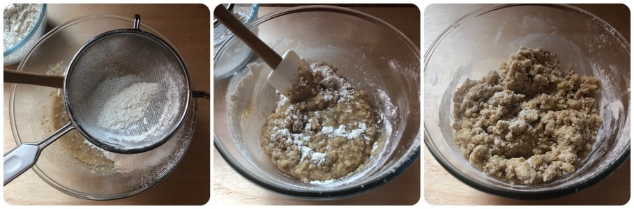 An diesem Punkt beginnen Sie, den Teig mit den Händen zu bearbeiten, um die Zutaten perfekt zu vermischen und große Krümel zu formen.