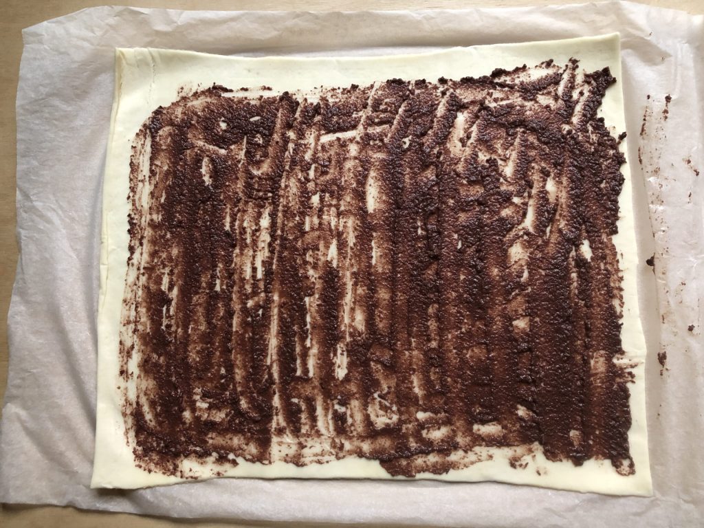 Den Blätterteig rechteckig ausrollen und auf dem mitgelieferten Backpapier liegen lassen. Dann vorsichtig mit der Teigrolle darüber gehen, um ihn ebenmäßiger zu machen.