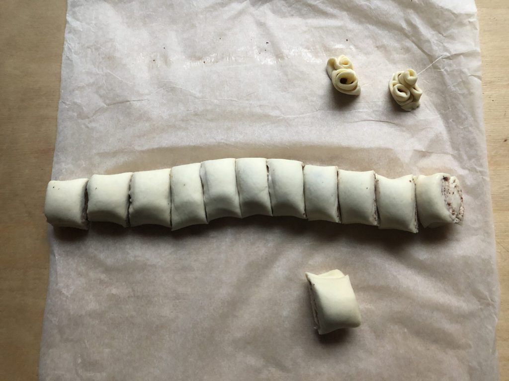 Jedes Stück nehmen und einen Schnitt machen, ohne das ganze Ende des Teigs zu berühren: Ihr werdet feststellen, dass jedes Stück einen ganzen und einen doppelten Teil hat. Der Schnitt sollte gemacht werden, indem der ganze Teil intakt bleibt.