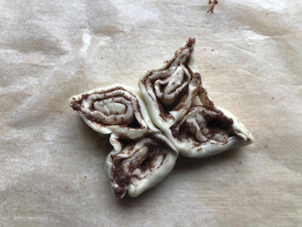 An diesem Punkt die beiden Enden öffnen und den ganzen Teil des Teigs in die Mitte bringen. Leicht mit den Fingern abflachen und die Flügel der Schmetterlinge formen.