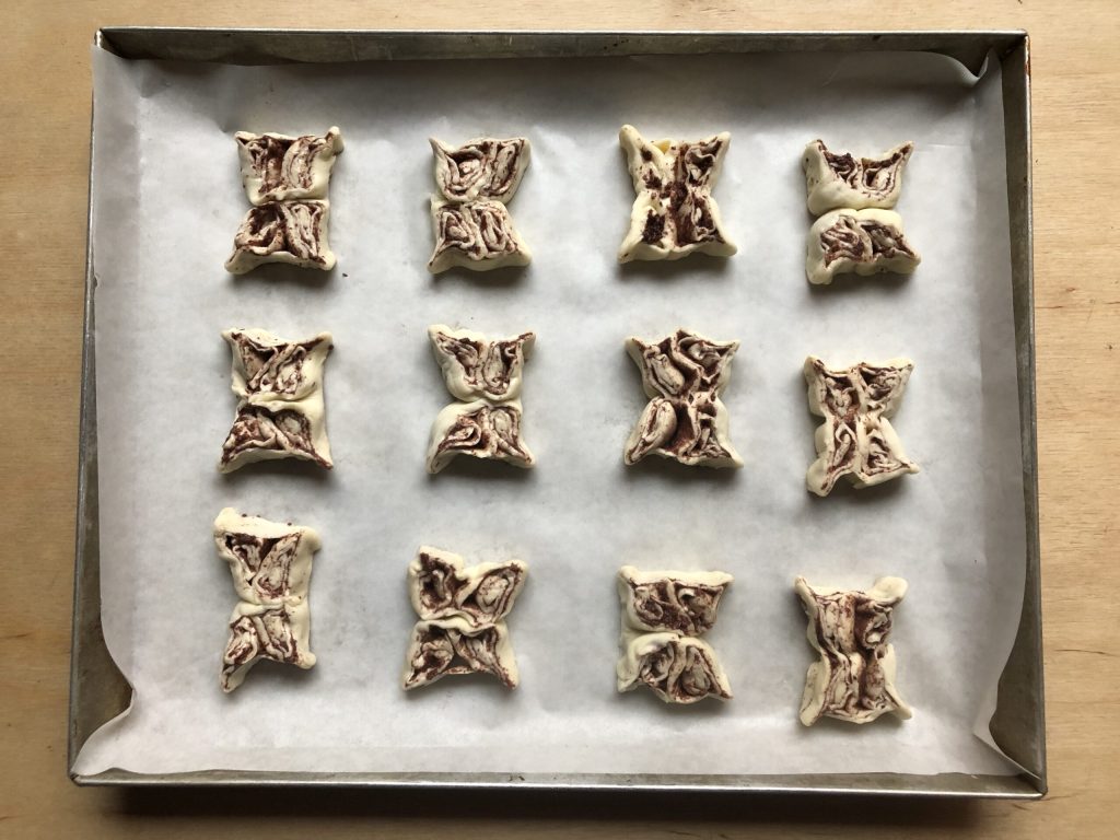 Die gesalzenen Blätterteigschmetterlinge nach und nach auf ein mit Backpapier ausgelegtes Backblech legen und dabei etwas Abstand zwischen ihnen lassen.