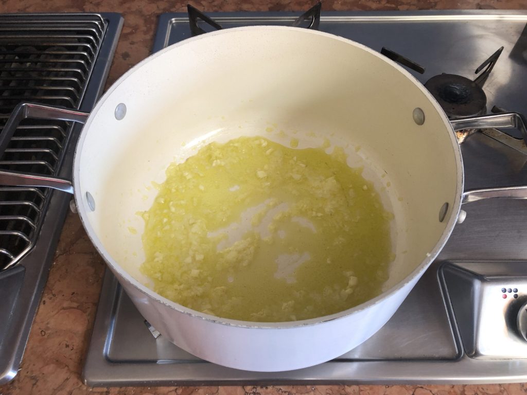 Die Zwiebel und die Knoblauchzehe schälen, fein hacken und in einigen Esslöffeln Öl in einer Kasserolle anbraten.