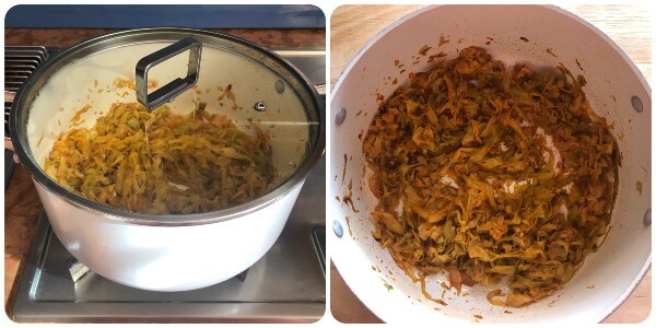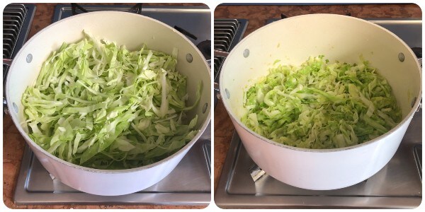 Einige Augenblicke brutzeln lassen, dann die Weißkohlstreifen, eine großzügige Prise Salz hinzugeben und etwa 10 Minuten lang unter gelegentlichem Rühren welken lassen.