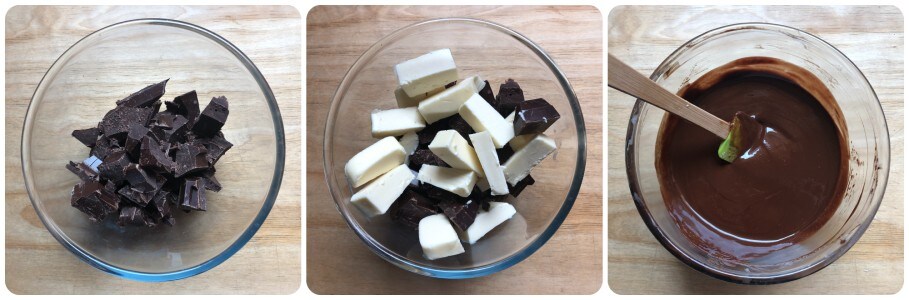 Die Schokolade in Stücke schneiden, in eine mittelgroße Schüssel geben, die Butter hinzufügen und alles im Wasserbad oder in der Mikrowelle schmelzen. Im letzteren Fall empfehle ich, 30 Sekunden bei 900W vorzugehen, dann umrühren und die gleiche Operation noch zweimal wiederholen, falls nötig. Es sollte eine glatte und klumpenfreie Creme entstehen. Diese abkühlen lassen.