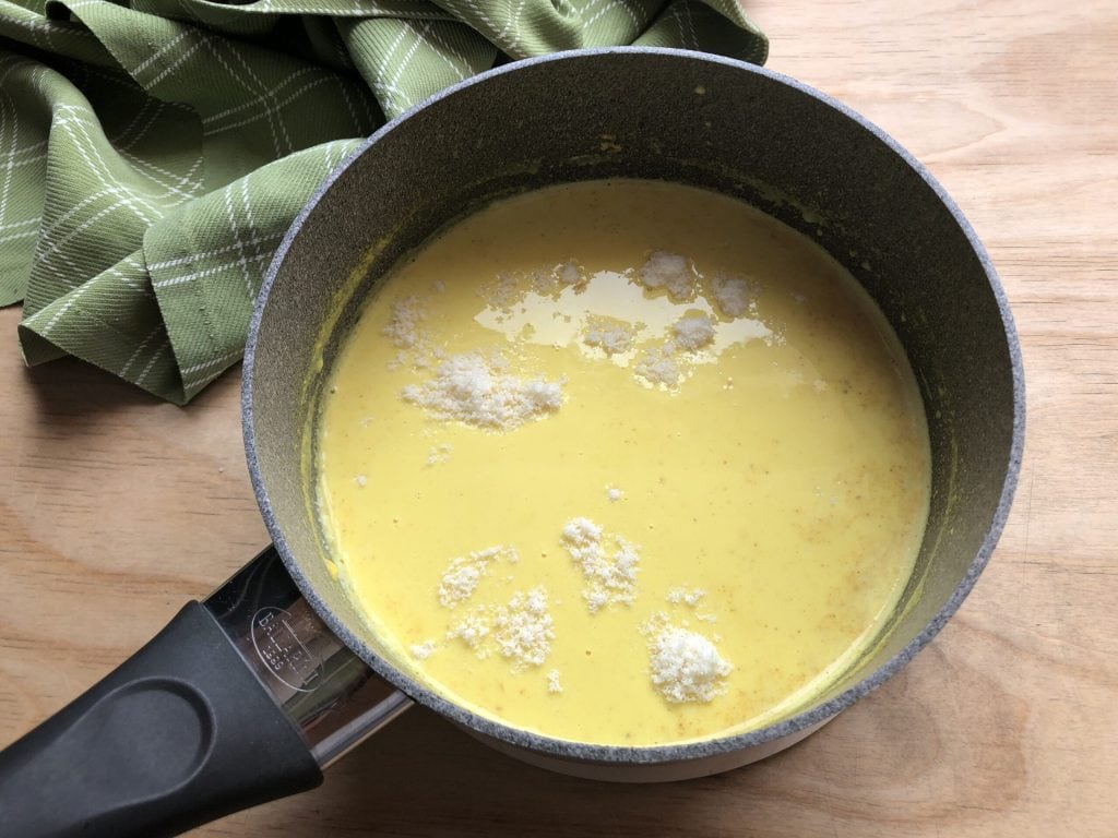 • Die Milch in einem kleinen Topf erhitzen, Kurkuma und eine großzügige Prise Salz hinzufügen.