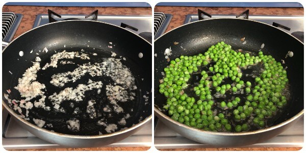 • In einer großen Pfanne die Butter schmelzen und die fein gehackte Schalotte darin anbraten. Wenn es zu brutzeln beginnt, die Erbsen und ein paar Esslöffel heißes Wasser hinzufügen.