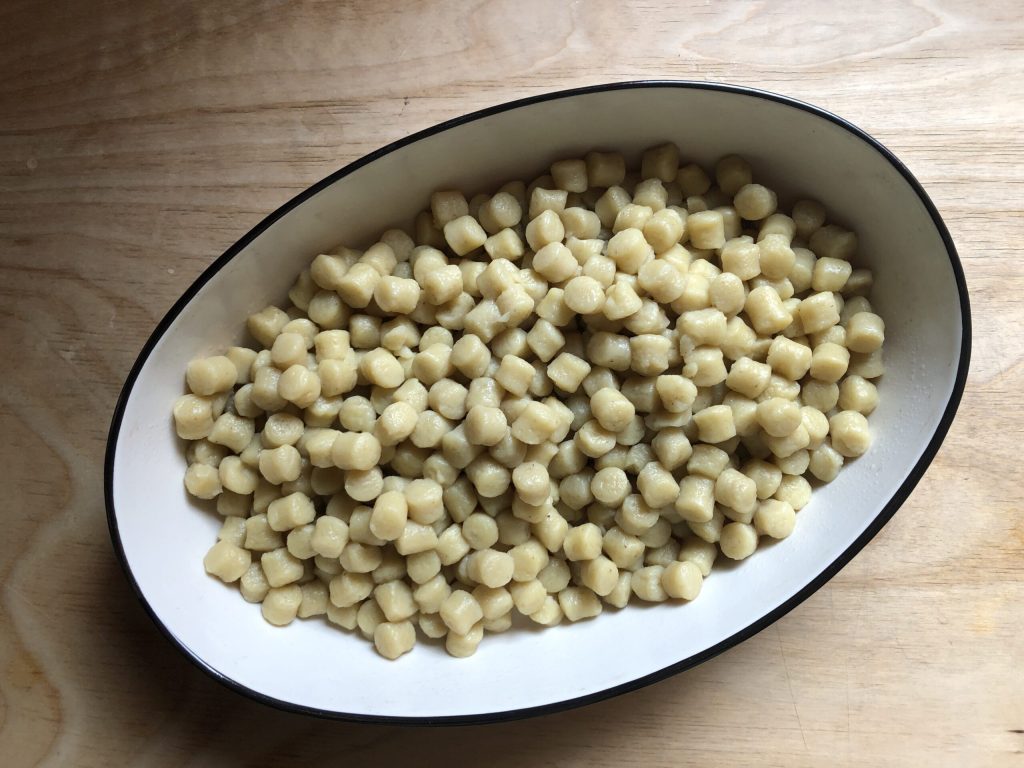 In der Zwischenzeit in einem großen Topf reichlich gesalzenes Wasser zum Kochen bringen. Dann die Gnocchi hineingeben und kochen, bis sie an die Oberfläche steigen. Dann mit einem Schaumlöffel abseihen und nach und nach in eine leicht gebutterte Auflaufform geben.