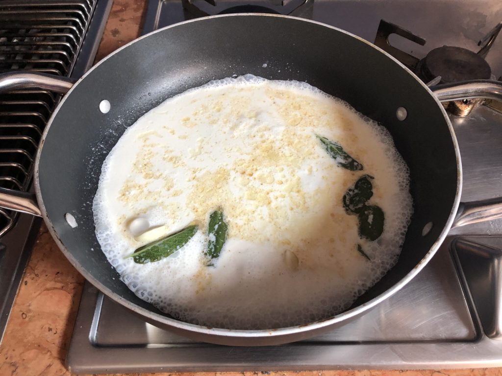In einer großen Pfanne die Butter mit einer geschälten und halbierten Knoblauchzehe und einigen Salbeiblättern schmelzen.