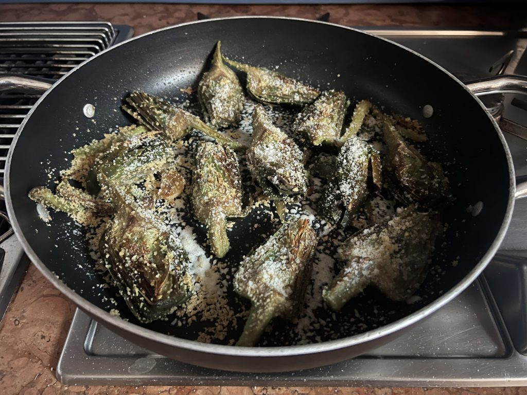 Die goldenen Artischocken aus der Pfanne sind servierbereit. Ihr könnt sie mit frisch gemahlenem schwarzem Pfeffer und gehackter Petersilie aromatisieren. Guten Appetit! Paola.