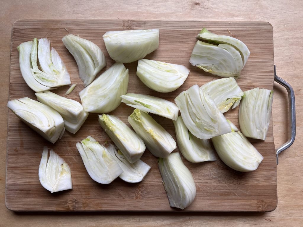 Die Fenchelknollen von den Stielen und einem Teil des Bodens befreien. Waschen, mit Küchenpapier abtupfen und in Spalten schneiden.