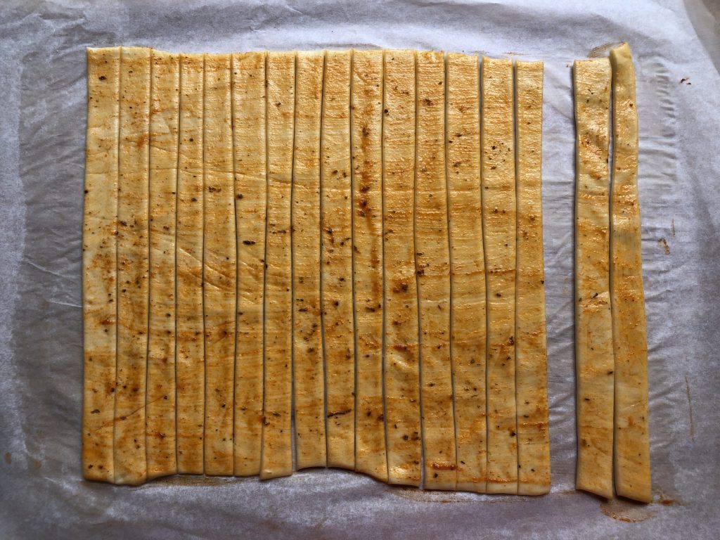 • Nun mit einem Pizzaschneider Streifen von knapp 2 cm Breite entlang der langen Seite des Rechtecks schneiden.