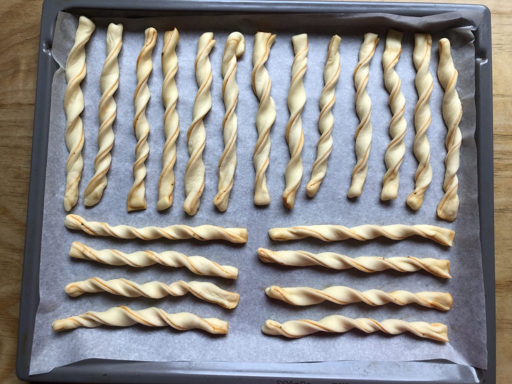 • Die Grissini alla Pizzaiola nach und nach auf das mit Backpapier ausgelegte Blech legen und dabei etwas Abstand zwischen ihnen lassen.