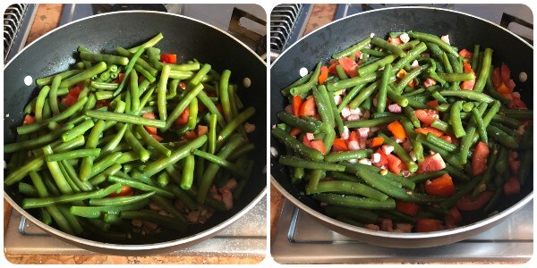 Dann die grünen Bohnen und Tomaten hinzufügen, vorsichtig umrühren und 5 Minuten ziehen lassen.
