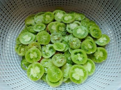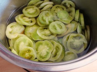 Die grünen Tomaten waschen und in nicht zu dicke Scheiben schneiden.