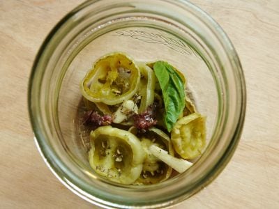 In die perfekt trockenen Gläser eine Schicht grüne Tomaten legen, dann ein Basilikumblatt, ein paar Stücke Knoblauch, ein Stück Sardelle und eine Prise Oregano hinzufügen.