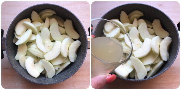 In einen Topf geben, mit Apfelsaft beträufeln, kurz umrühren und auf den Herd stellen.