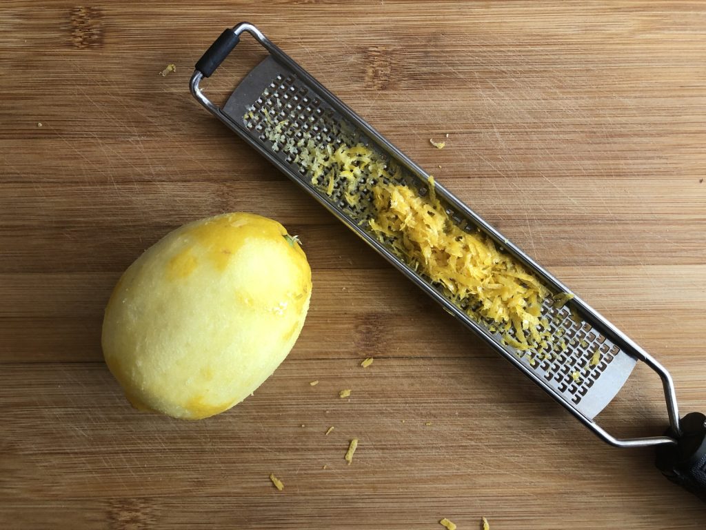 In der Zwischenzeit eine unbehandelte Zitrone gut waschen, abtrocknen und die Schale mit einer Zitrusreibe abreiben. Denken Sie daran, dass die Schale von herkömmlichen Zitronen nicht essbar ist, daher ist es wirklich notwendig, eine Bio-Zitrone zu verwenden.