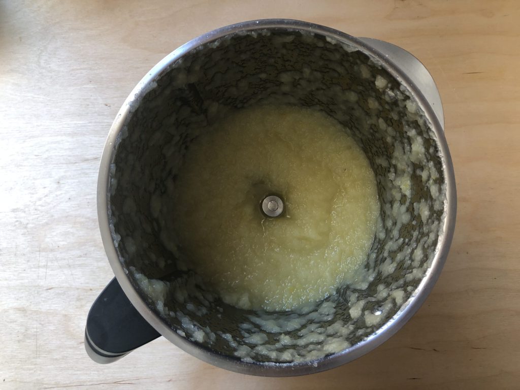Wenn die Äpfel abgekühlt sind, in einen Mixer geben, zusammen mit dem gesamten Kochfond.
