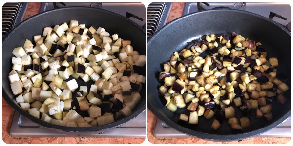Lassen Sie ihn einige Augenblicke brutzeln, dann fügen Sie die Auberginenwürfel hinzu und braten sie bei starker Hitze 7/8 Minuten, oft umrühren.