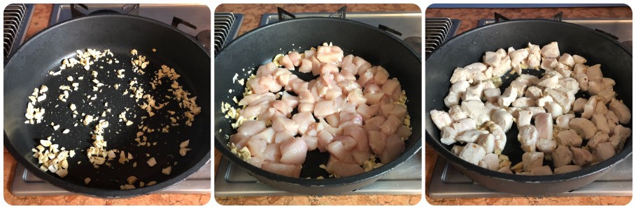 Reinigen Sie die Hähnchenbrust, indem Sie die Knorpel, den zentralen Knochen und die eventuellen Fettteile entfernen, und schneiden Sie sie dann in nicht zu kleine Stücke.
