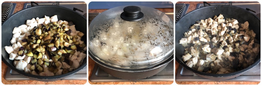 Wenn das Fleisch von allen Seiten angebraten ist, die Auberginenwürfel erneut hinzufügen, alles mischen, dann den Deckel aufsetzen und die Zubereitung für weitere 7/8 Minuten fortsetzen, gelegentlich umrühren. Dann den Deckel entfernen und für weitere 2 Minuten bei starker Hitze kochen. Falls die Sauce zu trocken wird, fügen Sie ein paar Esslöffel heiße Brühe hinzu.