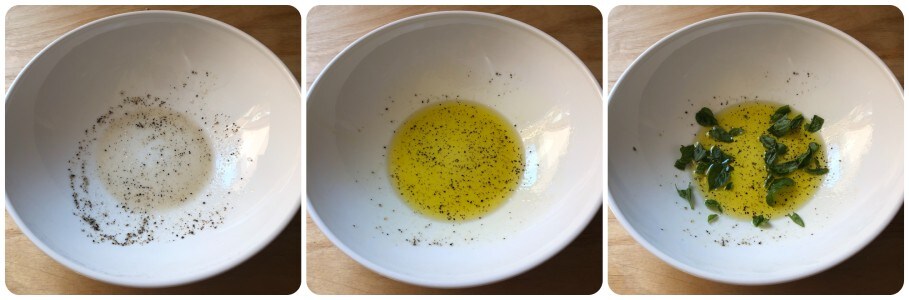 • In eine Salatschüssel ein paar Prisen Salz, eine großzügige Prise schwarzen Pfeffer und einen Esslöffel Essig geben. Rühren, bis sich das Salz vollständig aufgelöst hat, dann drei Esslöffel Öl hinzufügen und alles emulgieren. Schließlich auch das Basilikum mit den Händen zerkleinern und hinzufügen.