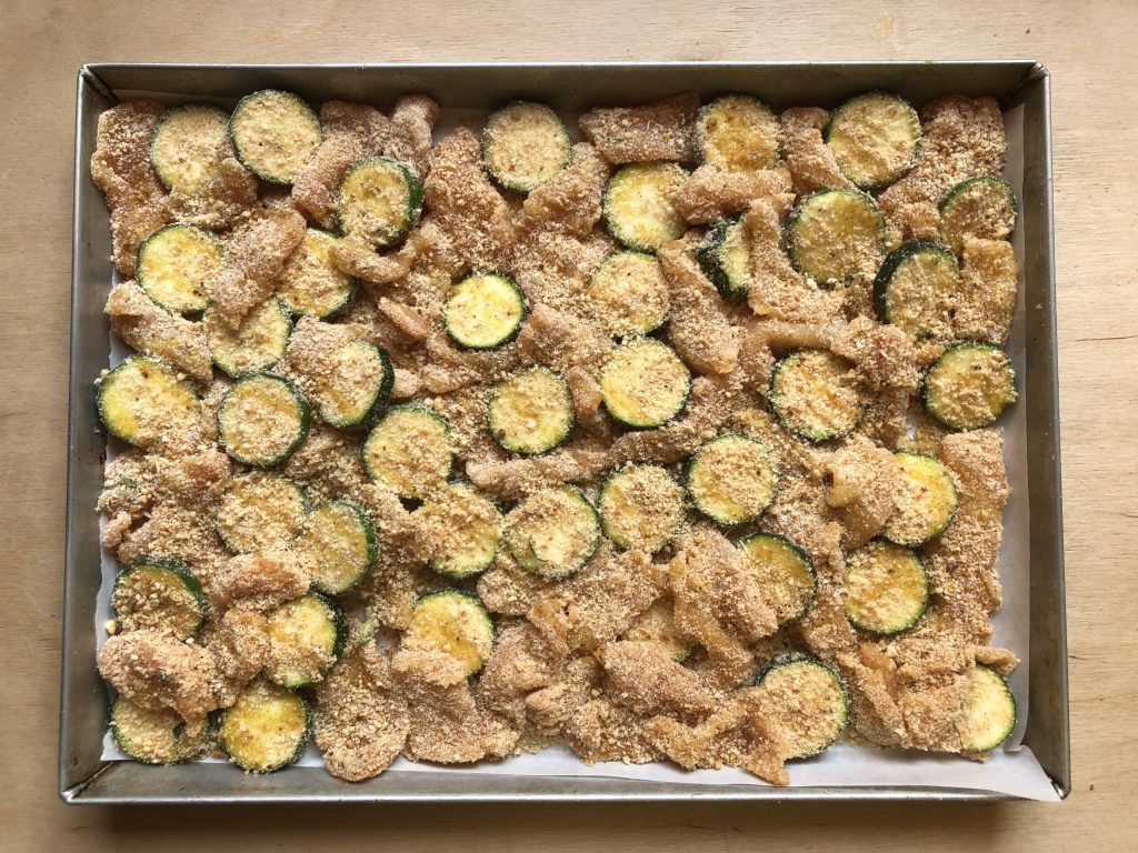 • Hähnchen und Zucchini auf einem mit Backpapier ausgelegten Blech verteilen, dabei versuchen, sie abzuwechseln. Schließlich eventuell übriggebliebene Panade darüber streuen und mit einem Schuss Öl beträufeln.