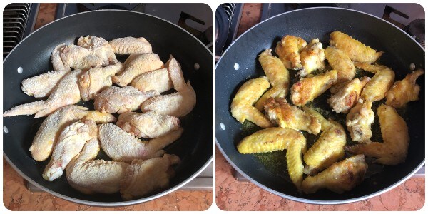 In einer großen Pfanne ein paar Esslöffel Öl erhitzen, bevor Sie die bemehlten Flügel hinzufügen. Den Deckel darauflegen und bei mittlerer bis niedriger Hitze 20 Minuten lang kochen, dabei gelegentlich wenden.