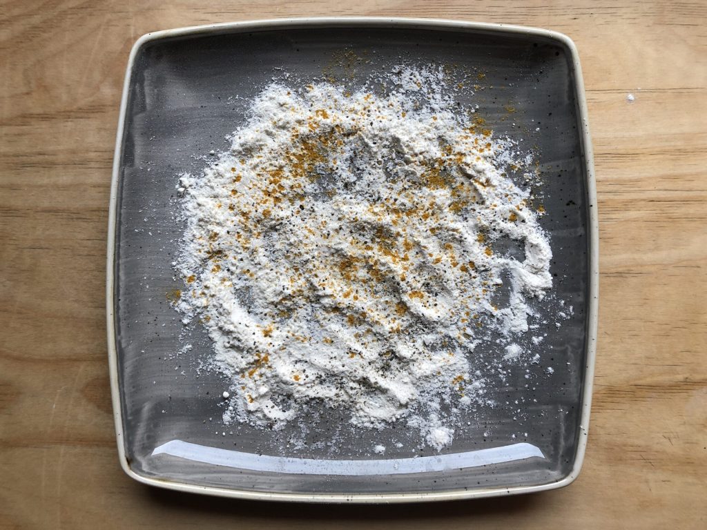 Mehl in einen Teller geben, zwei Prisen Salz, eine Prise schwarzen Pfeffer und eine Prise Curry hinzufügen und mischen. Sie können die Curry-Menge nach persönlichem Geschmack dosieren.