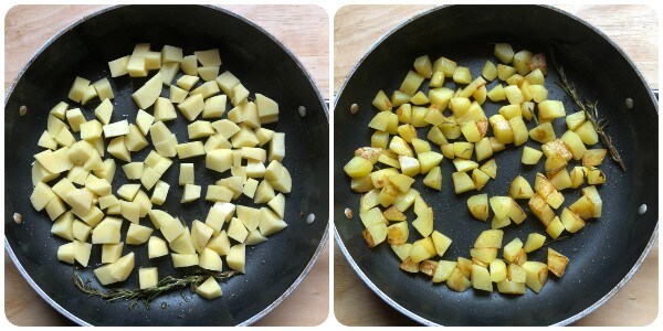 Die Kartoffeln in denselben Topf geben und bei hoher Hitze und geschlossenem Deckel 5 Minuten kochen, dann die Hitze leicht reduzieren und weitere 7/8 Minuten kochen. Häufig umrühren. Die Kochzeit der Kartoffeln hängt davon ab, wie groß die Stücke sind, die Sie geschnitten haben. Beobachten Sie sie daher gut, bitte. Sie sollten zart, aber nicht zerkocht sein.