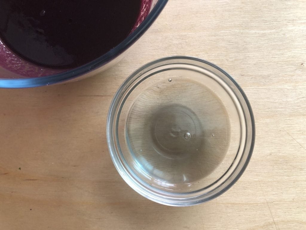 Sobald der Sirup abgekühlt ist, in die Schüssel mit der Heidelbeerflüssigkeit geben und vermischen.