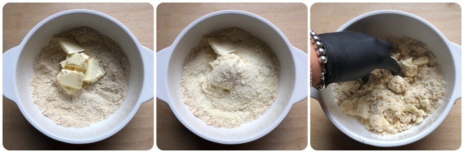 Dann die weiche Butter in Stücken, den geriebenen Käse und den Weißwein hinzufügen und von Hand kneten, bis eine glatte und homogene Mischung entsteht. Natürlich können Sie diesen Vorgang auch mit einem Mixer durchführen, wenn Sie möchten.