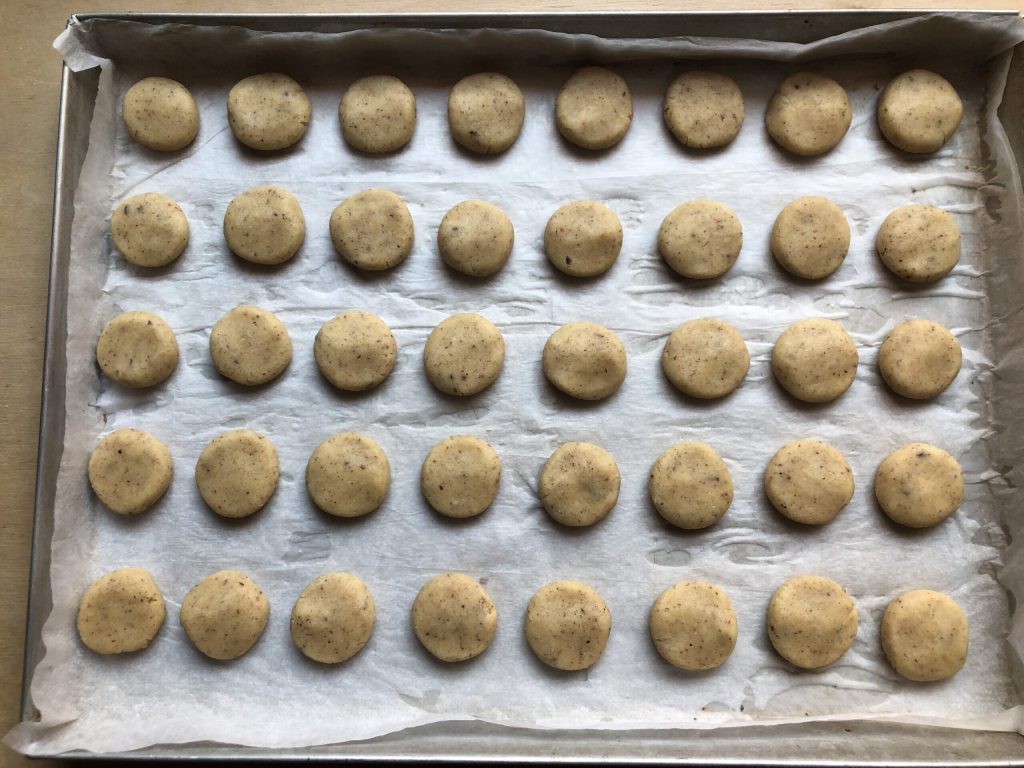 Legen Sie sie nach und nach in ein mit Backpapier ausgelegtes Backblech, wobei Sie einen kleinen Abstand zwischen ihnen lassen. Dann leicht drücken, damit die Basis flach wird.