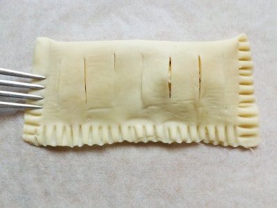 Nun den oberen Teil des Rechtecks über den gefüllten Teil klappen und die Ränder gut verschließen, zuerst mit den Fingern und dann mit den Zinken einer Gabel.