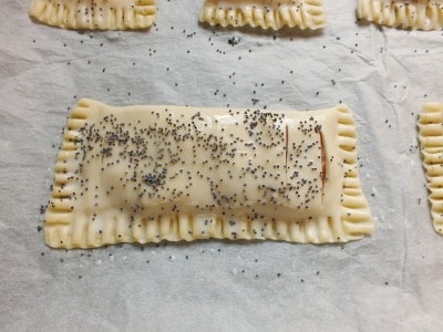Die herzhaften Taschen nach und nach auf das mit Backpapier ausgelegte Backblech legen, die Oberfläche mit etwas Milch bestreichen und mit Mohnsamen bestreuen.