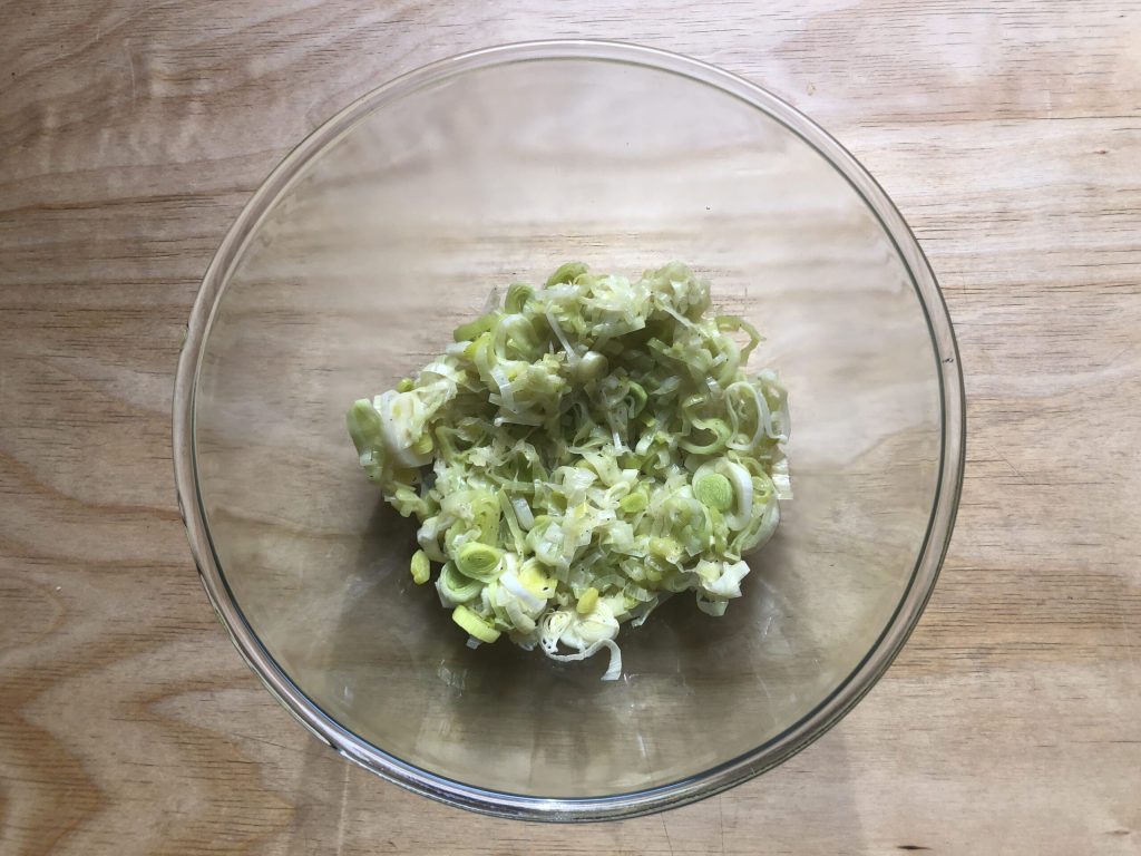 Den Lauch putzen, indem Sie die Wurzeln, die äußere Hülle und den dunkelgrünen Teil entfernen. Waschen und in dünne Scheiben schneiden.