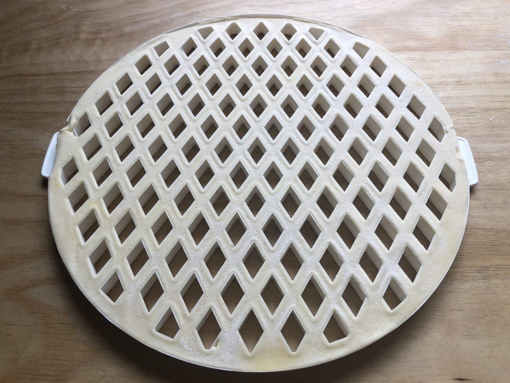 Einen Teigkreis auf das Kuchengitter legen. Um mehr über dieses Objekt und seine Funktionsweise zu erfahren, verweise ich auf einen Artikel, den ich vor einiger Zeit geschrieben habe. Sie können ihn lesen, indem Sie HIER klicken. Dieses Gitter finden Sie in Haushaltswarengeschäften oder online, indem Sie HIER klicken.