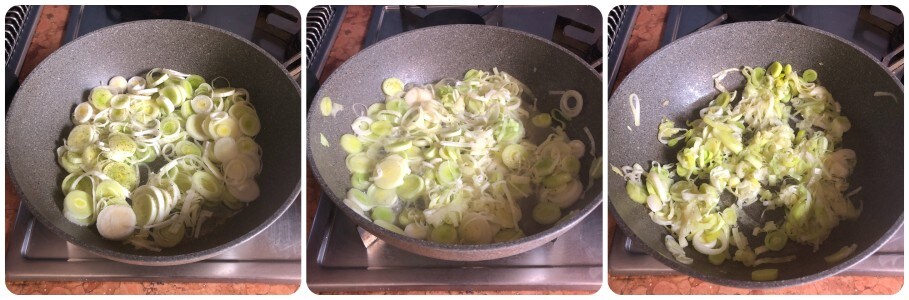 In einem nicht zu großen Topf einen Schuss Öl erhitzen, bevor Sie den Lauch hinzufügen. Fügen Sie ein paar Esslöffel Wasser, eine großzügige Prise Salz und eine Prise schwarzen Pfeffer hinzu und lassen Sie sie bei schwacher Hitze 5/6 Minuten lang unter häufigem Rühren und Zugabe von Wasser andünsten, falls erforderlich.
