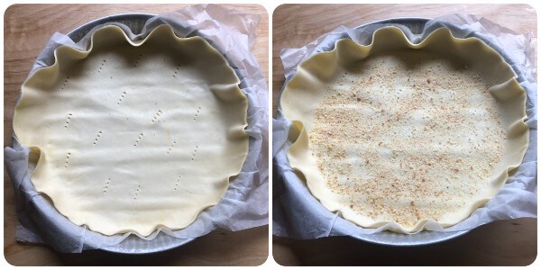 Den zweiten Blätterteigkreis in eine Springform mit einem Durchmesser von 24 cm legen und auf dem Backpapier belassen, das in der Verpackung enthalten ist. Den Boden mit einer Gabel einstechen und mit Paniermehl bestreuen.