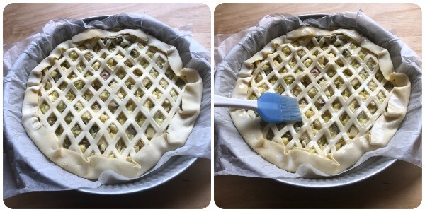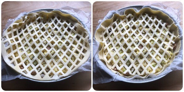 Für die Abdeckung dieser herzhaften Torte habe ich ein Kuchengitter verwendet. Natürlich ist dies kein obligatorischer Schritt. Sie können sich entscheiden, die herzhafte Torte mit einer zweiten ganzen Teigscheibe zu schließen oder Streifen zuzubereiten und eine rautenförmige Oberfläche ähnlich der klassischen Marmeladenkuchen zu schaffen. Alternativ können Sie sich auch entscheiden, die Torte nicht zu schließen. In diesem Fall klappen Sie einfach die Ränder der unteren Teigscheibe über die Füllung.