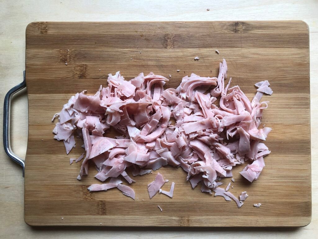 Die Scheiben des gekochten Schinkens in Streifen schneiden.