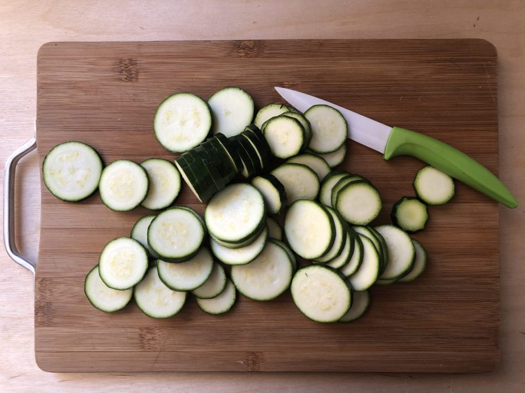 Die Zucchini abspitzen, waschen und mit einem Messer in Scheiben schneiden. Verwende keinen Hobel, da die Scheiben sonst zu dünn werden.
