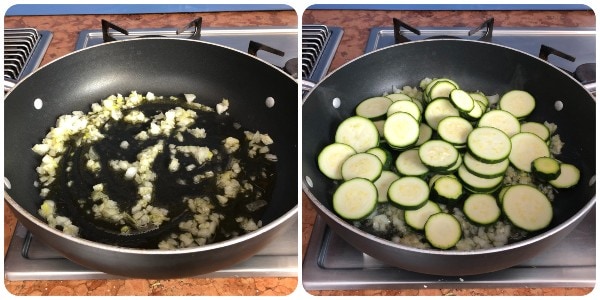 In einer Pfanne einige Esslöffel Öl erhitzen und die Zwiebel hinzufügen. Kurz anschwitzen lassen, dann die Zucchini, eine Prise Salz hinzufügen und 6/7 Minuten kochen.