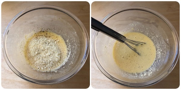 In der Zwischenzeit die Eier in einer Schüssel aufschlagen, das Mehl hinzufügen und mit einem kleinen Handschneebesen kräftig schlagen.