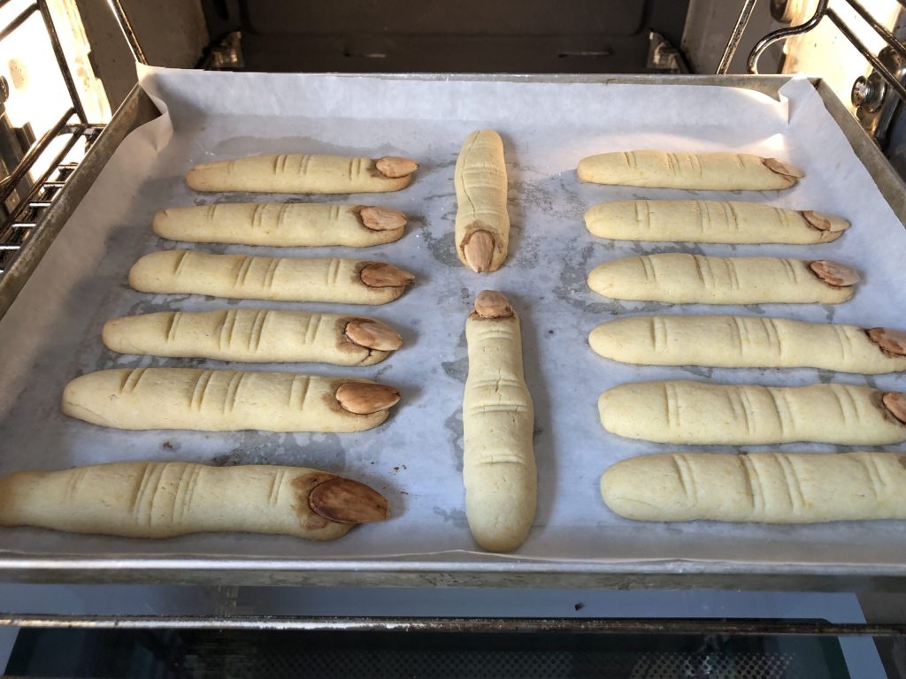 Die Hexenfinger nach und nach auf ein mit Backpapier ausgelegtes Blech legen. Um dies ohne Beschädigung zu tun, empfehle ich, einen Teigschaber oder eine Palette zu verwenden.