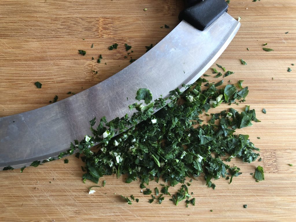 • Die Knoblauchzehe schälen, den inneren Kern entfernen und zusammen mit der Petersilie fein hacken.